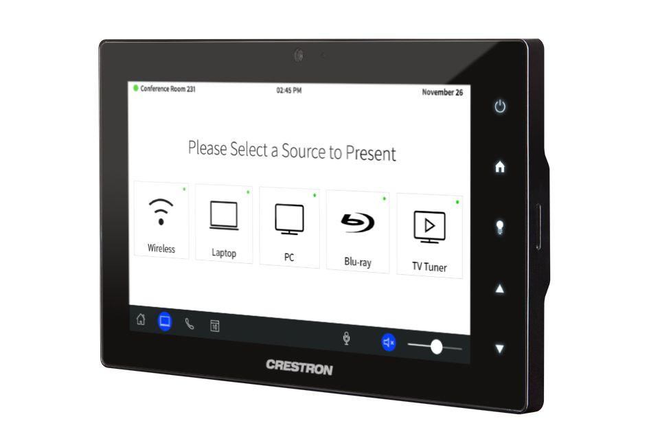 A space-saving wall, lectern, tabletop, or rack mount touch screen featuring a clean, contemporary appearance with edge-to-edge glass and advanced high-definition Smart Graphics®. Features onboard voice recognition, web browsing, H.264 streaming video, built-in camera, Rava® SIP Intercom, room scheduling, and PoE+ network power.