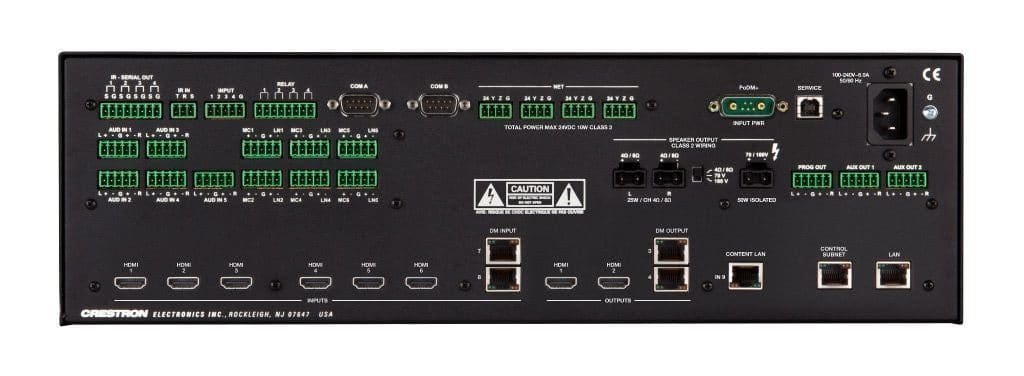 Provides a complete 4K AV presentation control and signal routing solution for boardrooms and classrooms. Integrates the control system, matrix switcher, video scaler, streaming decoder, mic mixer, audio DSP, amplifier, and DigitalMedia distribution center all into a single 3-space rackmount package.